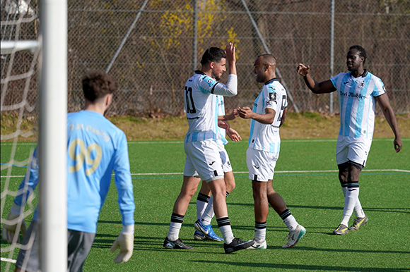 Salif Boubacar (v. re.), und Kenyan Price gratulieren Josef Tohmaz zum Treffer zum 4:0. Foto: Joachim Mentel